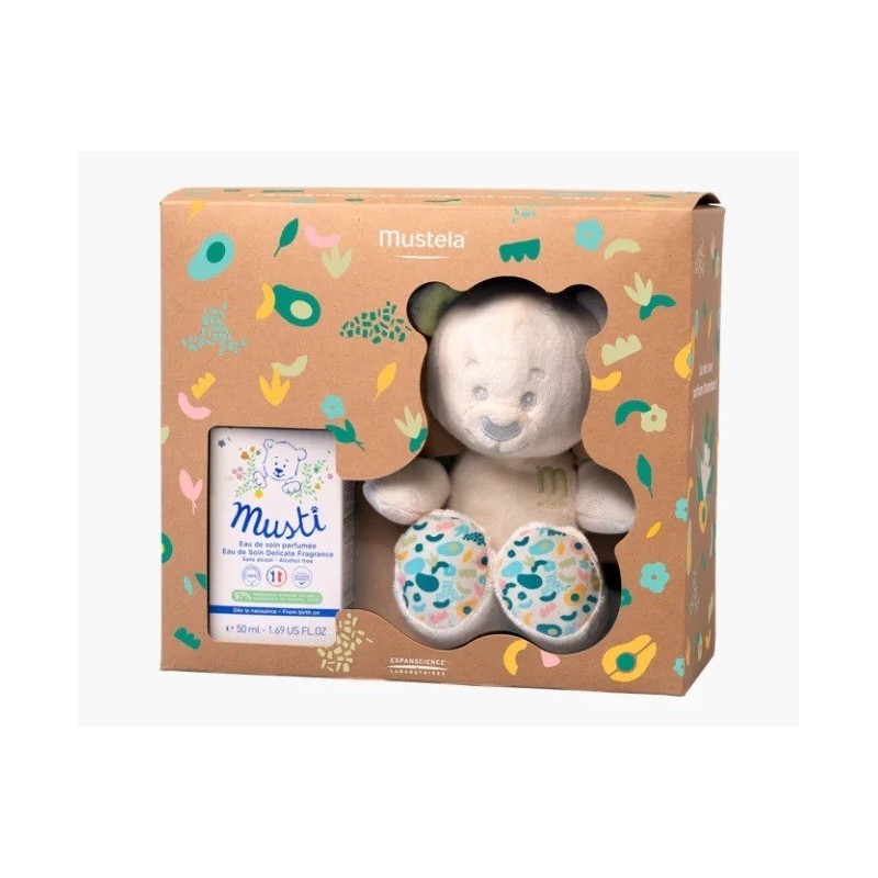Nuestro nuevo cofre musti es un kit de colonia para bebés y niños que incluye la nueva edición del osito musti. Es el regalo para recién nacidos ideal para el desarrollo sensorial de los bebés: combina el delicado perfume de la colonia eau de soin musti, sin alcohol y apto para su uso desde el nacimiento*, con la suavidad de un nuevo y colorido oso de peluche, disponible en color terracota o pastel. El osito está fabricado con material 100% reciclado** y el envase más responsable en papel kraft.